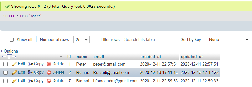 De gebruikerstabel heeft 5 records met dubbele e-mail [email protected]